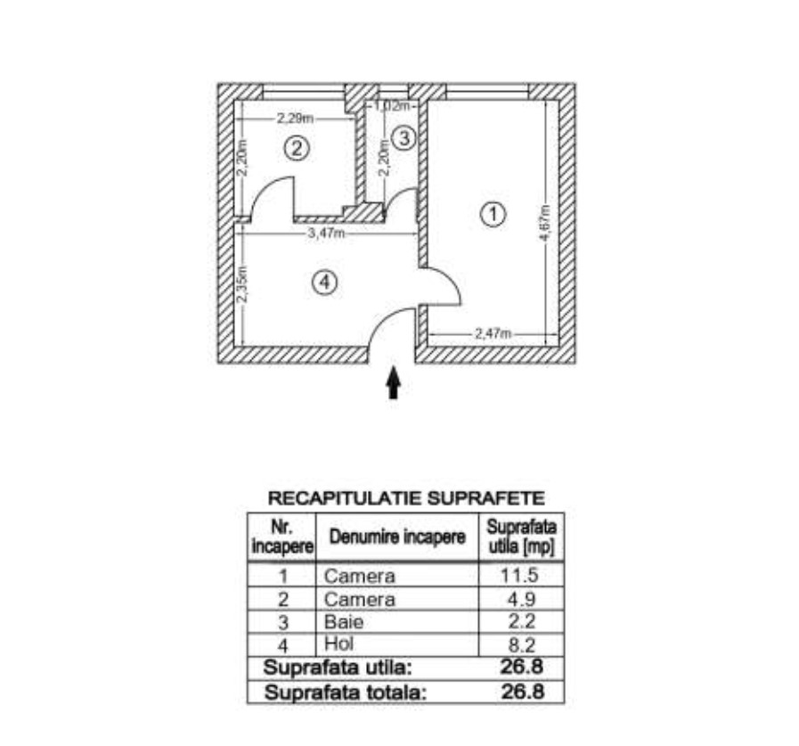 Apartamentul este situat la etajul 2 al unui bloc de locuințe cu regim de înălțime P+4E, edificat in jurul anilor `70 si este compus din 2 camere, semidecomandat cu suprafata de 26.8 mp.