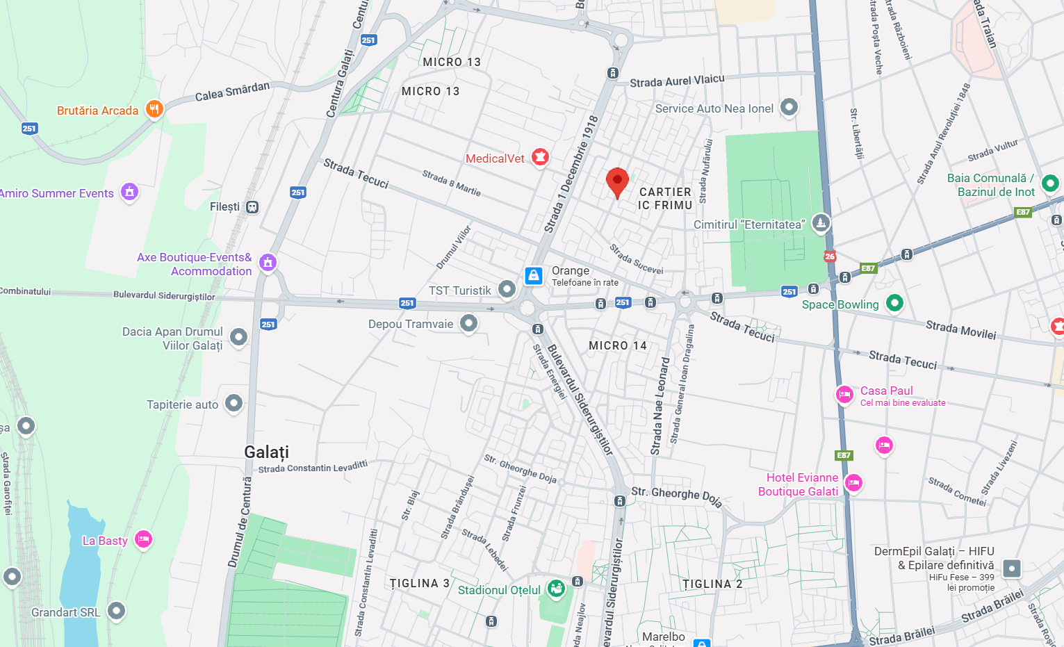 Imobilul este amplasat in cartie I.C. Frimu, zona liniștită, acces facil la mijloace de transport și centre comerciale, in imediata apropiere a Mall SHOPING CITY Galati.