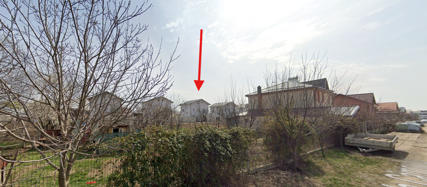 - Teren intravilan în suprafață de 396,58 mp (cotă indiviză din totalul de 2.072 mp), împrejmuit parțial cu gard de plasă și gard de beton.