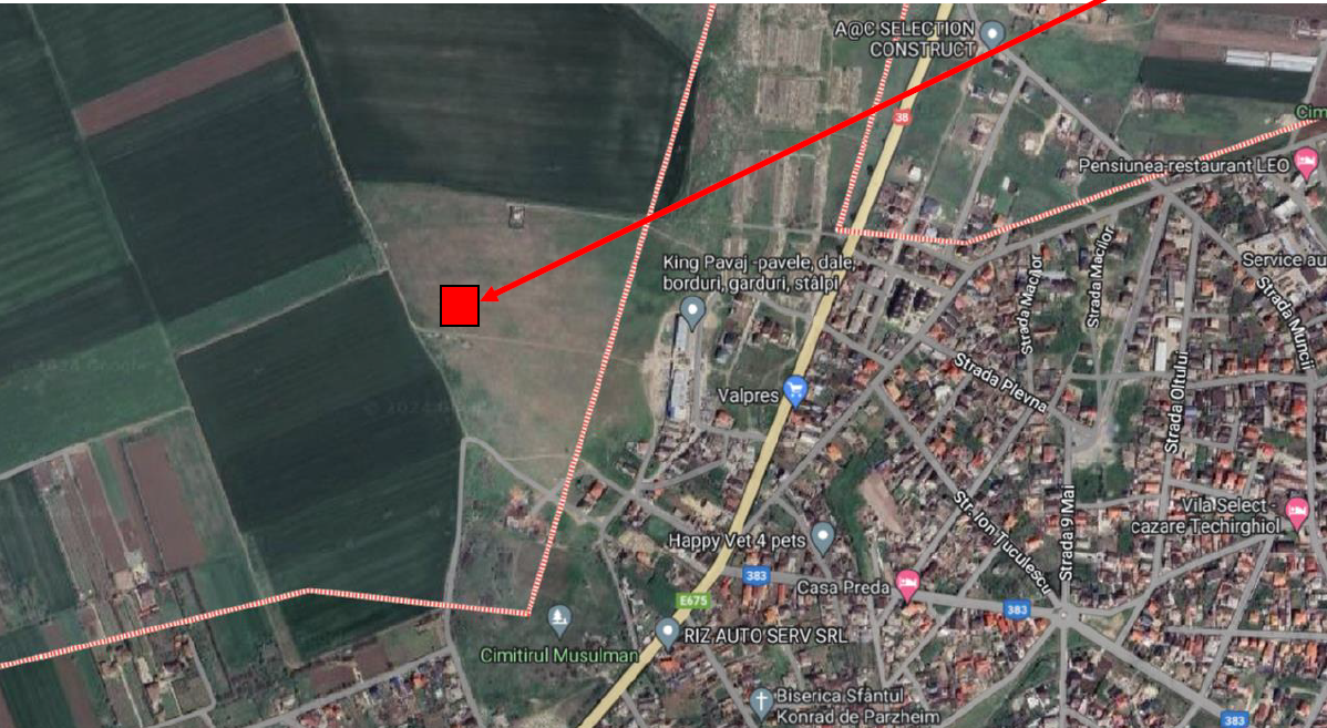 Teren in suprafata de 450 mp. situat in vestul localității, in extravilan, in apropierea intravilanului, intr-o zona de inceput de dezvoltare rezidentiala, distanta pana la cea mai apropiata zona sistematizata de locuințe din intravilan este de circa 400 m, avand deschidere de 15 ml. la calea de acces, drum de pamant.Terenul este neimprejmuit, avand o forma regulata plana.