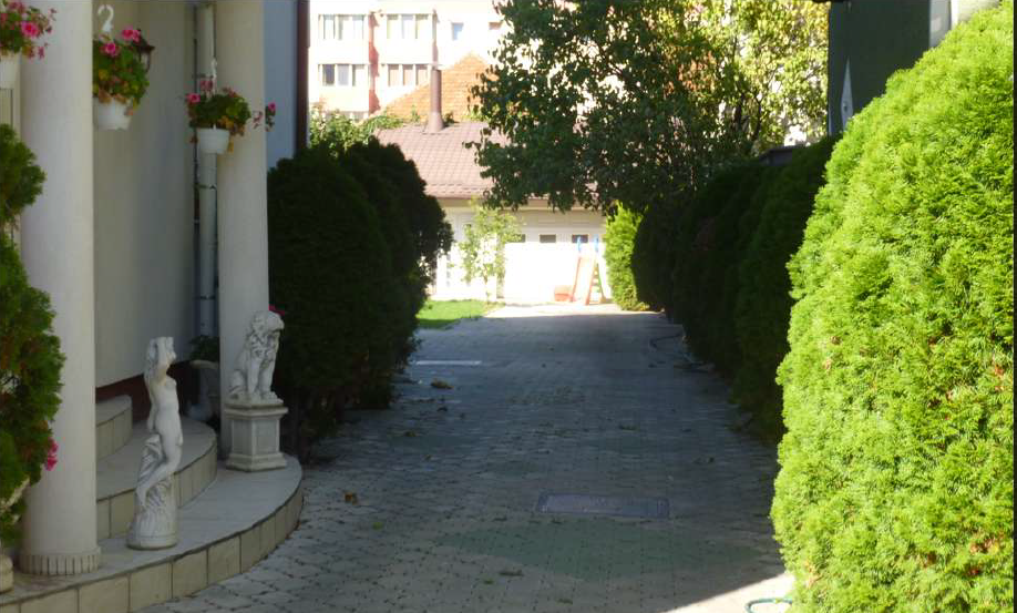 - Amenajări: zonă pavată, gazon, vegetație ornamentală