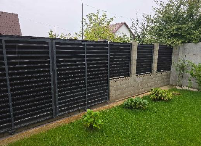 - Împrejmuire completă: beton + panouri + porți fier forjat